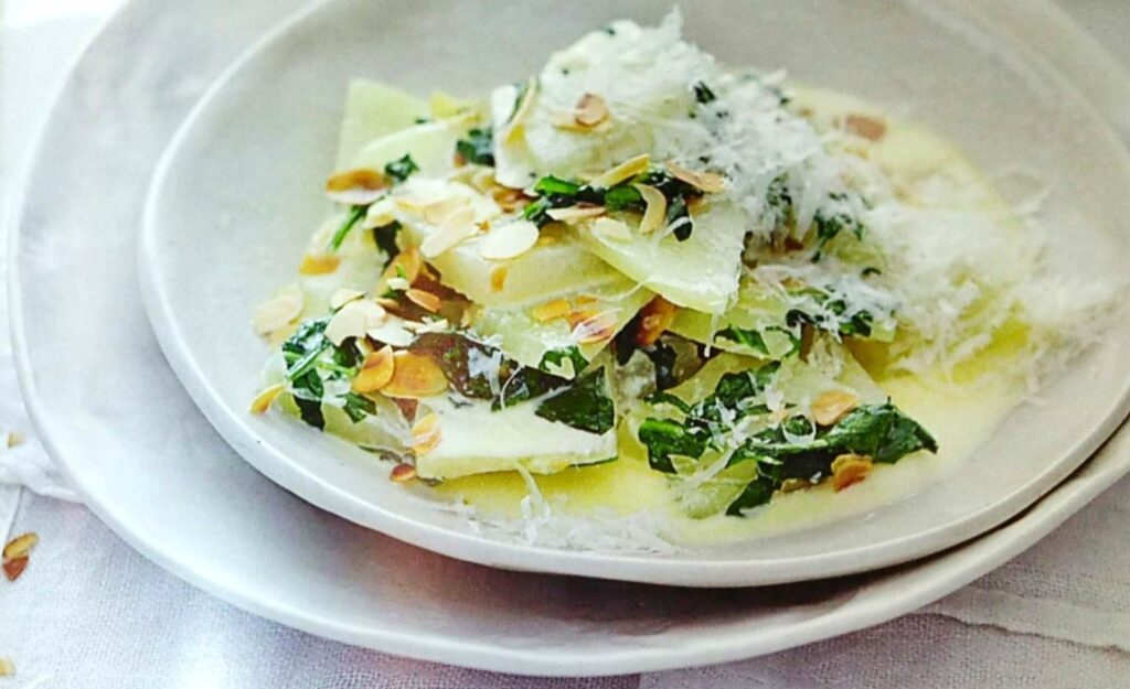 Kohlrabischeiben in Bouillon und Rahm dünsten, zum Schluss kommen Rucola, geröstete Mandeln und frischer Parmesan dazu – und die Blättchen vom Kohlrabi.
